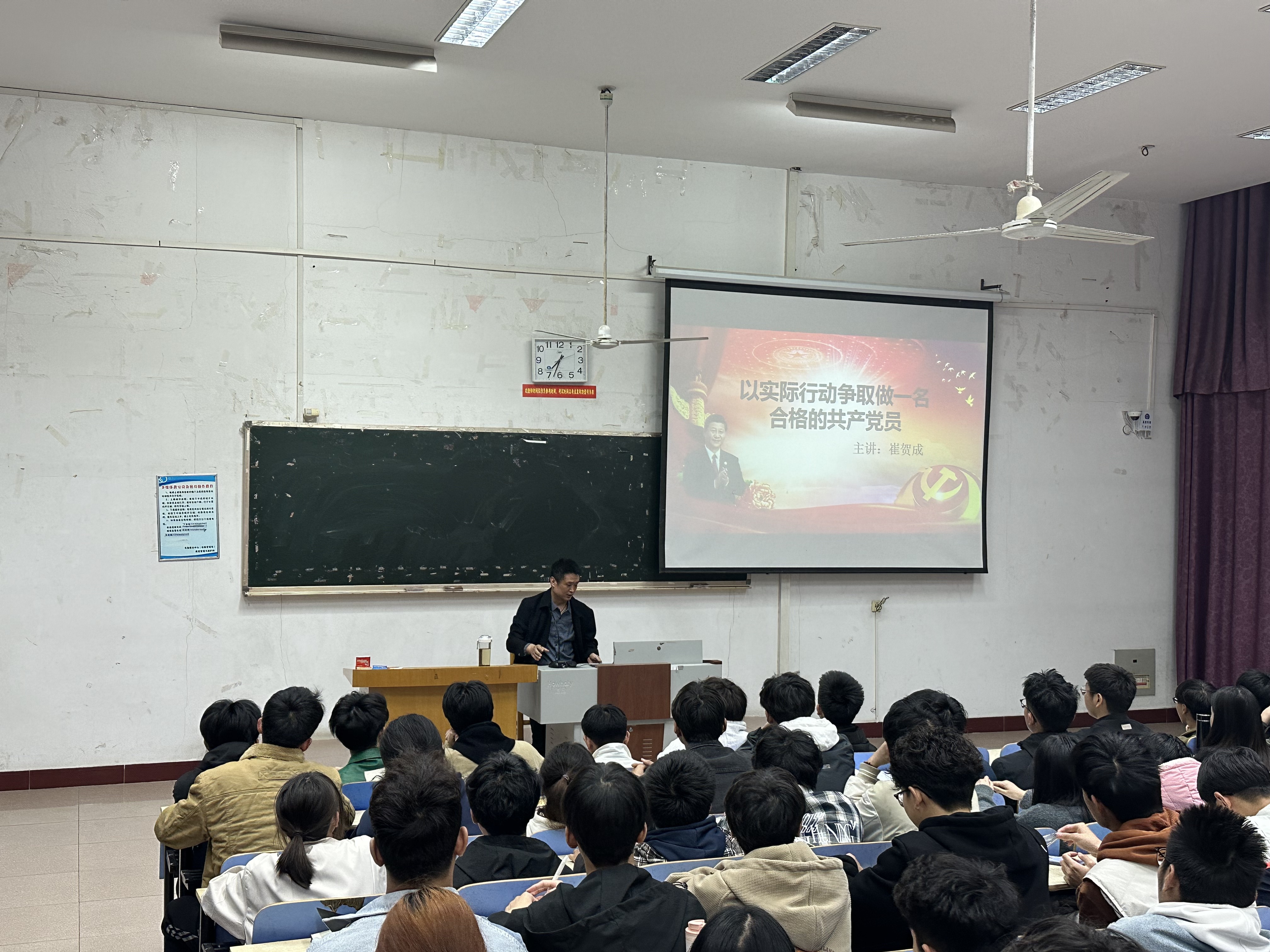 开班仪式后,党委副书记崔贺成以《以实际行动争取做一名合格的共产党员》为题讲了分党校培训第一课。他围绕积极分子如何成为一名合格党员,对大家提出了具体要求,勉励大家以“四个做到”,践行青春梦想:一是做到“讲政治”,自觉增强“四个意识”、坚定“四个自信”、坚决做到“两个维护”,始终在政治立场、政治方向、政治原则、政治道路上同以习近平同志为核心的党中央保持高度一致,不断增强思想自觉和政治意识。二是做到“讲忠诚”,始终以党的旗帜为旗帜、以党的方向为方向、以党的意志为意志,保持政治方向不偏,政治立场不移,不断增强政治理论学习,学会从政治上看问题,在实践中坚定政治站位。三是做到“讲担当”,深刻认识自身所面临的时代际遇和历史责任,将个人梦与中国梦结合起来,在当前阶段紧紧围绕主题教育学习活动,主动担当、积极作为。四是做到“当表率”,争当勇于创新的表率,在学习与科研、创新与创业活动中展现活力与创造力;争当服务奉献的表率,带动身边同学在甘于奉献、乐于奉献中焕发青春光彩。