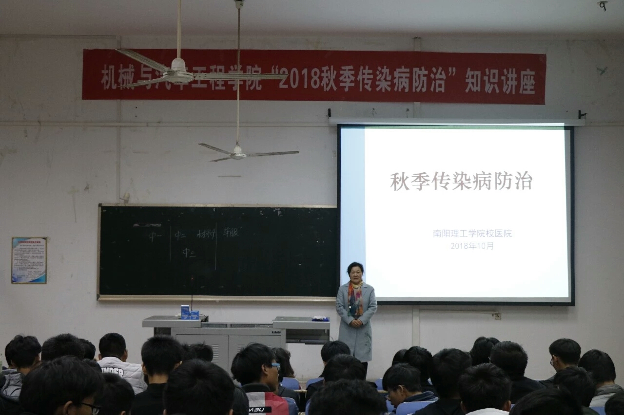 本网讯(通讯员:李佳奇)为增强学生对疾病的防患意识,机械与汽车工程学院于6201举办“秋季传染病防治”知识讲座。讲座由南阳理工校医院的医生耿蕊主持。大一全体学生参与本次讲座。