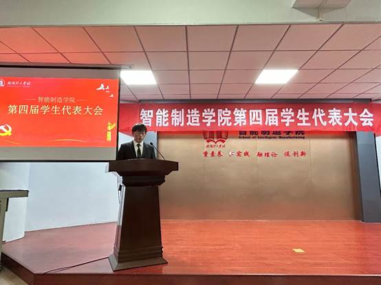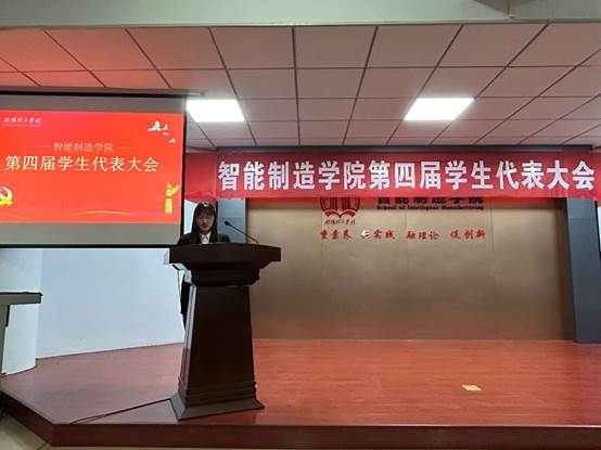 第三届学生会主席王泓森作《智能制造学院第三届学生会工作报告》。报告总结了一年来学生会的重点工作,并提出了对学生会工作的思考与对未来工作的建议。学生团委副书记王钰铭作《智能制造学院团委兼职副书记工作报告》。