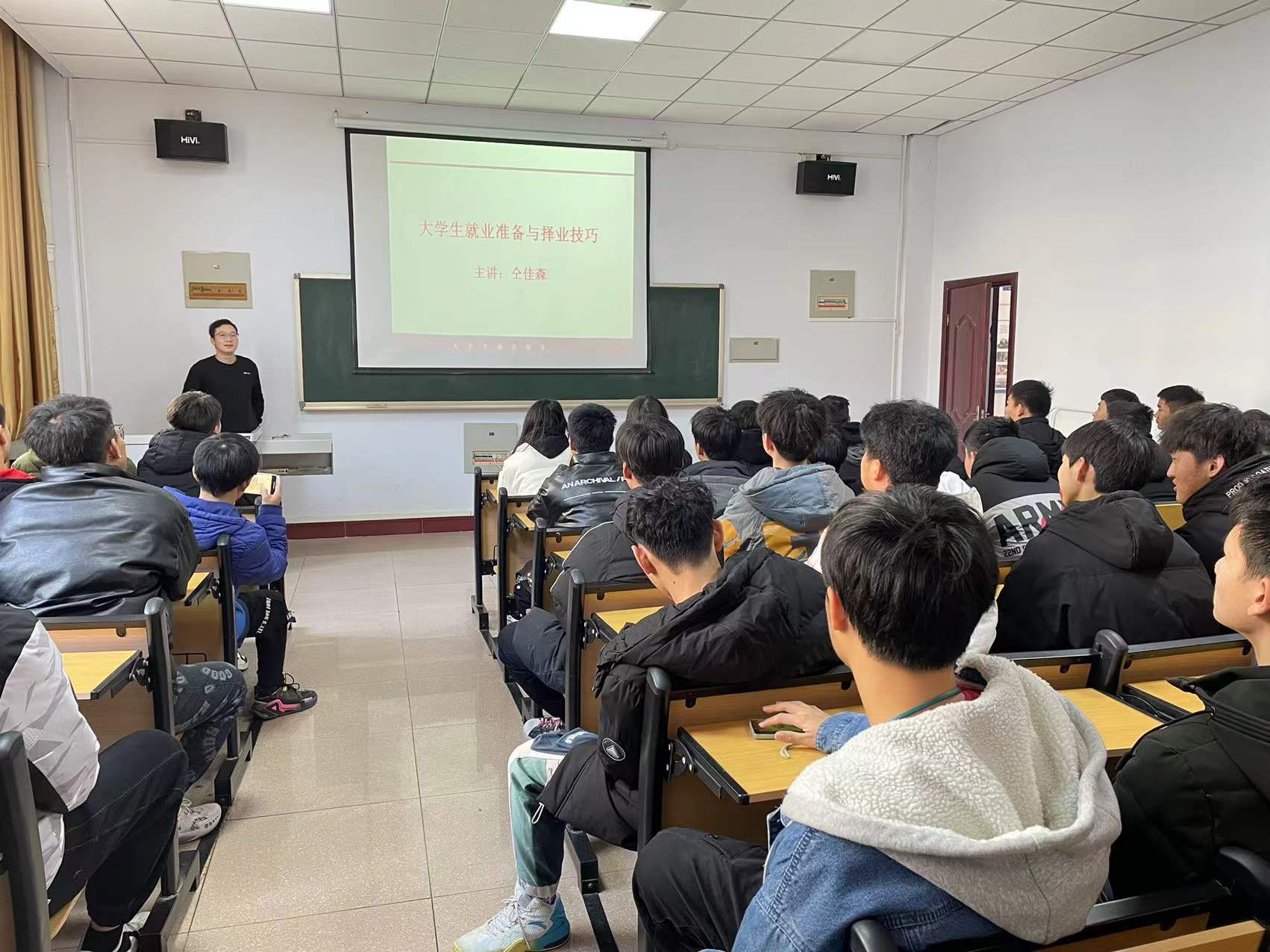 学院党委副书记崔贺成针对大学生就业难题、简历制作、面试技巧等方面开展专题培训。学院负责就业创业工作的辅导员老师仝佳森从创新创业的时代意义、双创大赛的解读以及备赛干货等方面进行讲述,指导同学们更好地在各类竞赛中做出成绩。