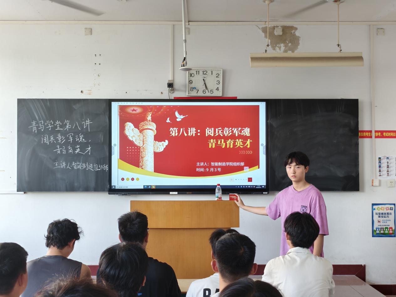 为使大学生感受军魂力量,将其融入自身成长,助于坚定理想信念、厚植家国情怀,智能制造学院于9月3日举办了“阅兵彰军魂,青马育英才”为主题的青马学堂第八讲。