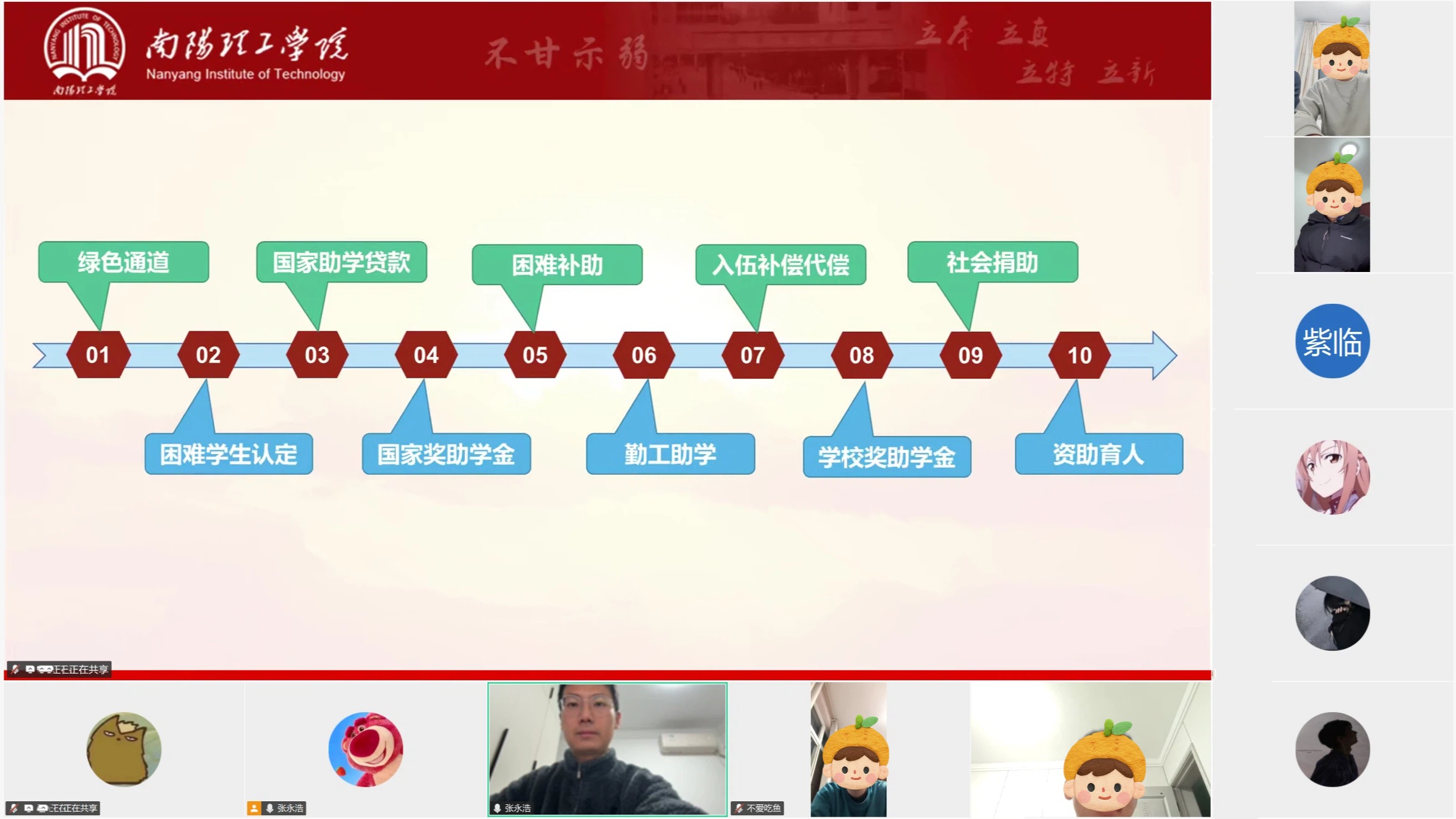 活动中,张永浩老师首先详细解读了国家及学校现行的资助政策体系,包括国家助学金、国家励志奖学金、临时困难补助、勤工助学岗位申请流程等,重点强调了2025—2026学年春季学期相关资助工作的安排与注意事项。