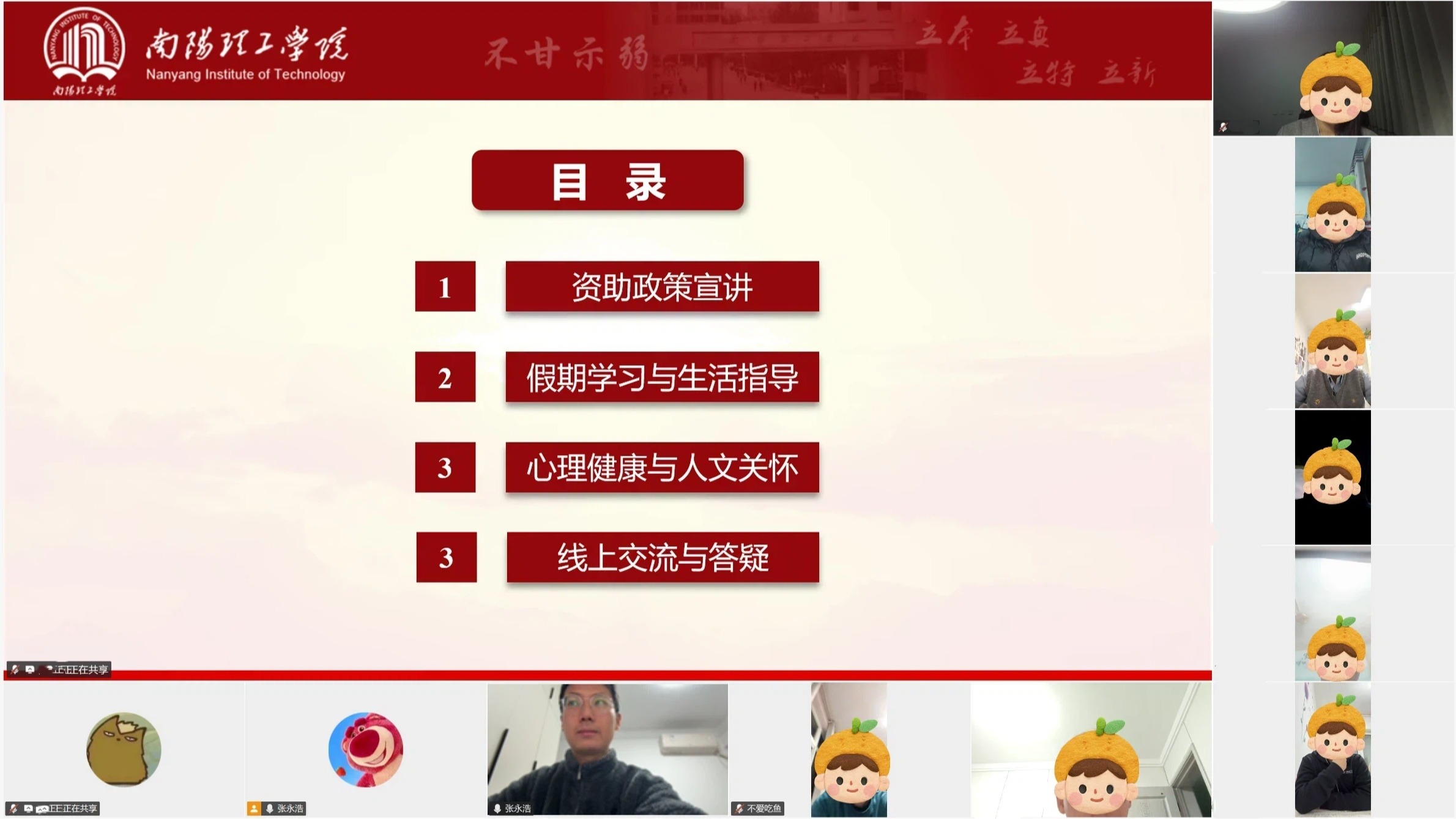 为持续落实“精准资助、暖心育人”工作理念,切实关心寒假期间家庭经济困难学生的学习与生活状况,1月18日,智能制造学院通过线上平台组织开展2026年寒假家庭经济困难学生线上走访活动。学院资助专干张永浩老师与学院家庭经济困难学生“云端”相聚,围绕资助政策宣讲、假期合理规划、心理健康关怀等内容展开深入交流。