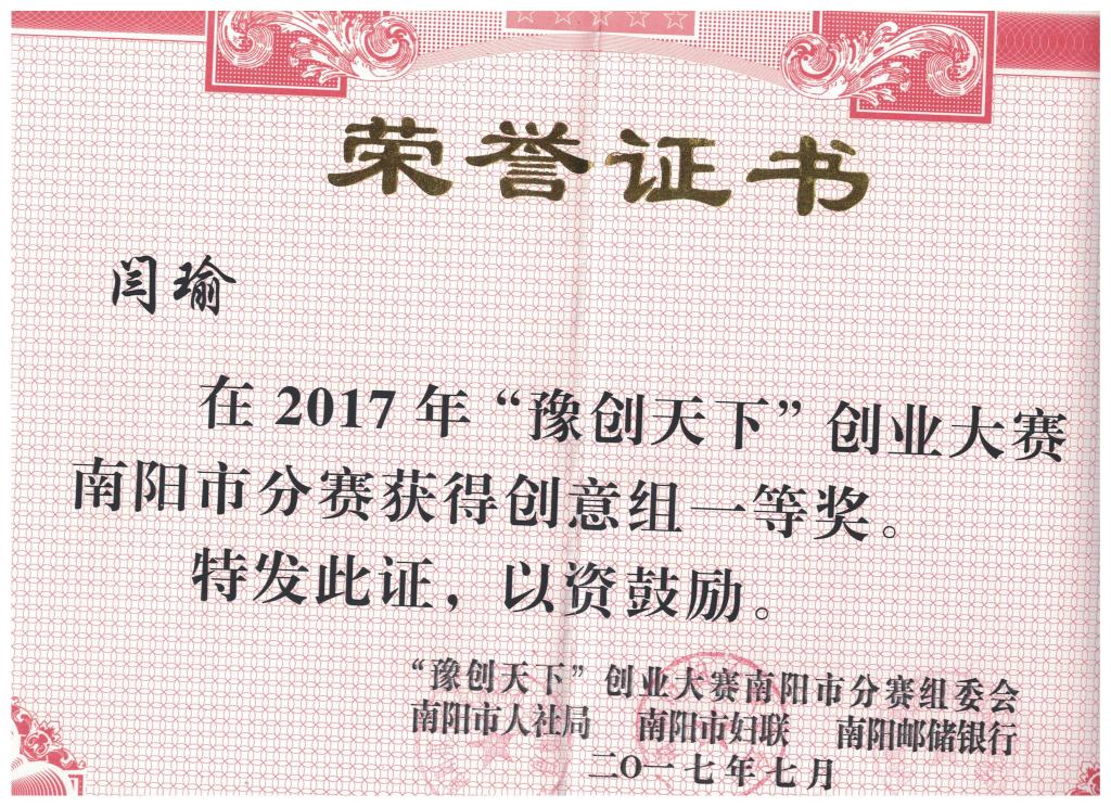 7月20日下午,由南阳市人力资源和社会保障局、南阳市妇女联合会、中国邮政储蓄银行股份有限公司南阳分行联合主办的南阳市2017年创业大赛暨河南省“豫创天下”创业大赛南阳赛区决赛在南阳市电视台直播大厅成功举办,我院闫瑜同学获得创意组一等奖的优异成绩。