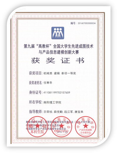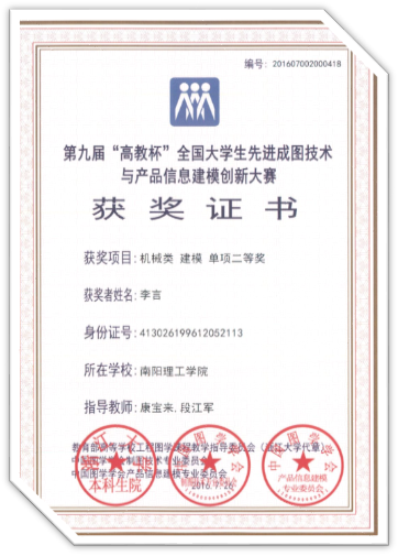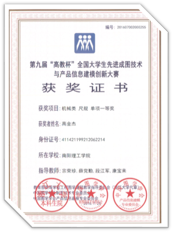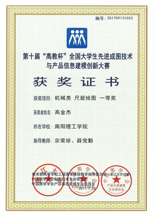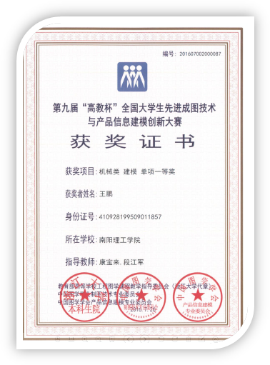 2016年7月在山东理工大学进行的第九届“高教杯”全国大学生先进成图技术与产品信息建模创新大赛,机械与汽车工程学院荣获尺规绘图一等奖2项,三维建模一等奖3项,个人全能二等奖1项,三维建模与尺规二等奖3项。