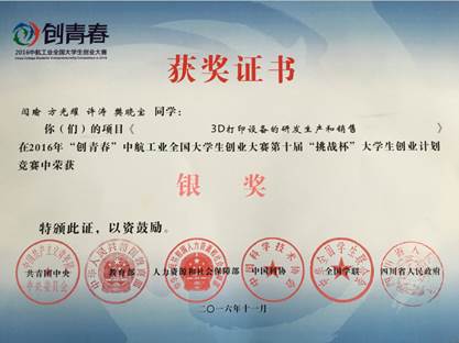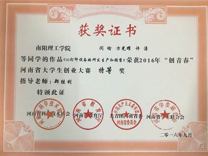其中2016年《3D打印设备的研发生产和销售》参加“创青春”希芳阁河南省大学生创业大赛荣获特等奖,代表河南省参加2016“创青春”全国大学生创业大赛,并获得创业计划国家级银奖,创我校“挑战杯”竞赛历史最好成绩,实现历史突破。2017年第十五届“挑战杯”全国大学生课外学术科技作品竞赛陈永辉老师指导的学生荣获“河南省特等奖”,并代表河南省参加了国赛,荣获国赛三等奖。