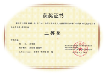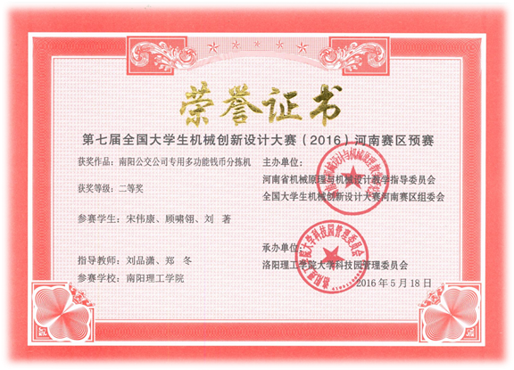 2016年5月,在洛阳理工学院举行第七届全国大学生机械创新设计大赛(河南赛区)比赛中,我校参加的《南阳公交钱币分拣机》获得二等奖。