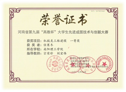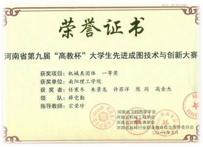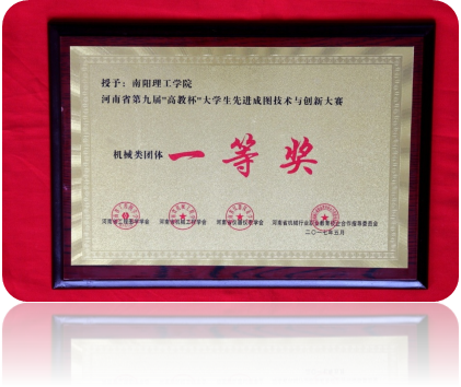 2017年5月在河南机电职业学院参加的河南省第九届“高教杯”大学生先进成图技术与创新大赛中,机械与汽车工程学院荣获“团体一等奖”,尺规一等奖2项,二等奖3项,三等奖5项,三维建模一等奖1项,二等奖7项