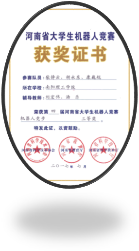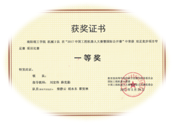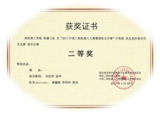 2017年5月在郑州轻工业学院举行的河南省第四届机器人比赛中,机械与汽车工程学院首次组队参加,荣获二等奖1项,三等奖2项。