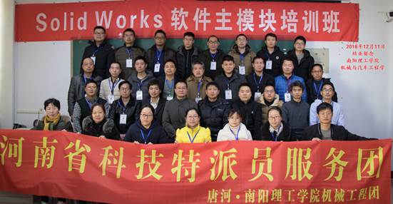 2018年12月7日至11日,河南省科技特派员服务团-南阳理工学院机械学院服务团,根据对唐河机械制造类企业研发现状的调研情况,有针对性的面向唐河制造类企业的核心技术人员进行当前工业设计中普遍使用的SolidWorks软件免费培训。唐河县科技局对辖区内企业进行了精确筛选和严密的组织,共有5家企业,13名技术人员参加了本次培训。