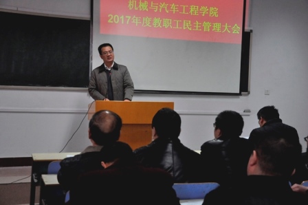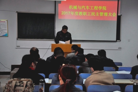 本报讯(通讯员:宁石东)2017年3月17日14:30,在庄严的国歌声中,机械与汽车工程学院召开2017年度教职工民主管理大会,学院50余名教职工参加本次会议。会议由机械学院副院长熊运昌主持。