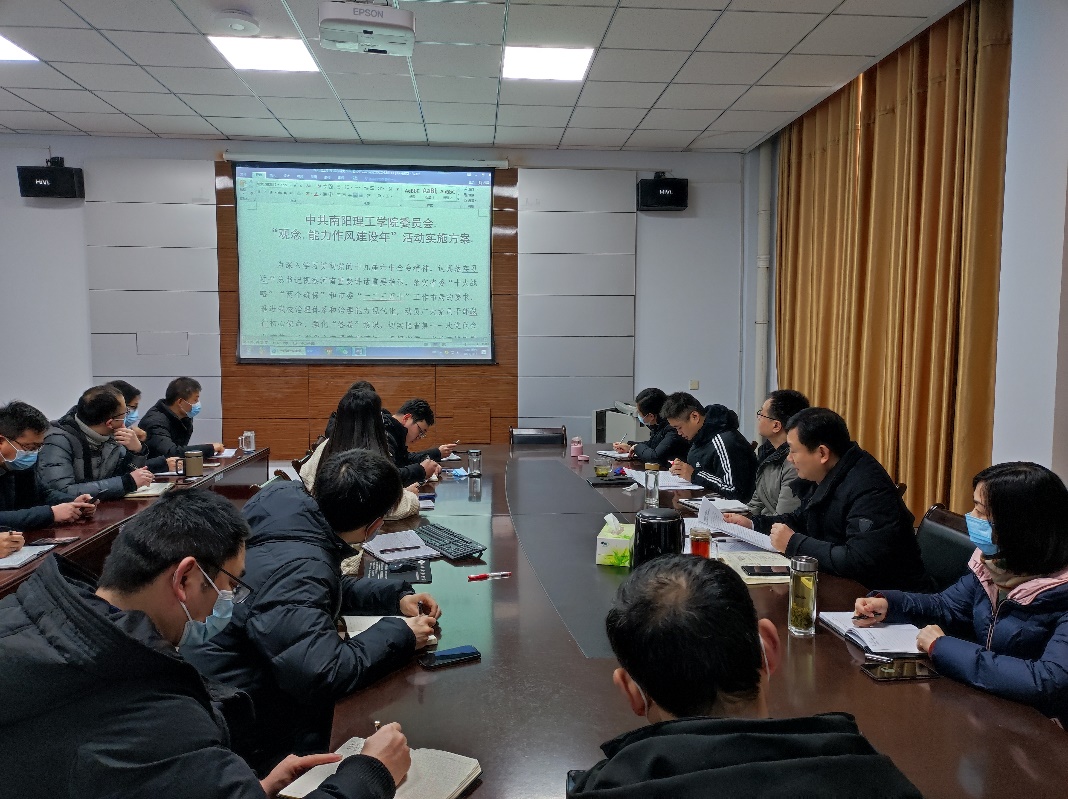 会议宣读了《中共南阳理工学院委员会“观念能力作风建设年”活动实施方案》《南阳理工学院“转作风、提效能、促发展”作风建设集中整顿实施方案》《南阳理工学院“查堵点、破难题、建机制、快落实”活动实施方案》《南阳理工学院“解放思想、更新观念”大讨论活动实施方案》,根据市委“观念能力作风建设年”活动要求,对学院活动作具体安排部署。