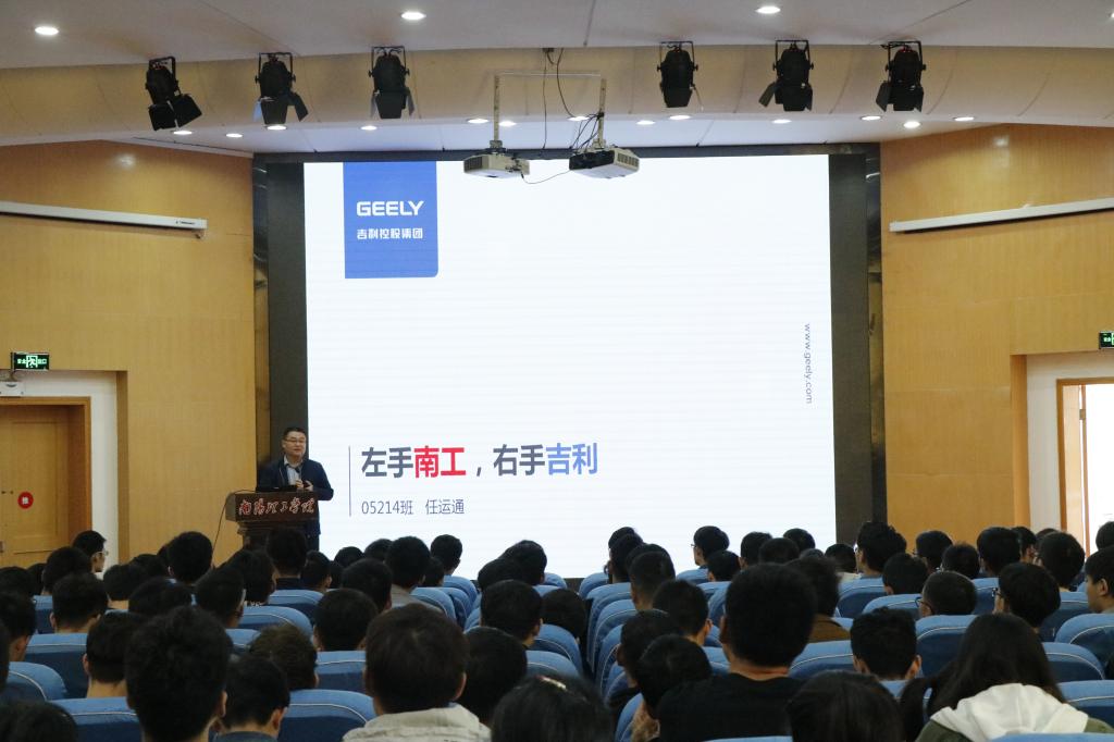 任运通校友以理想与现实的关系为开场白,引发同学们一起追忆他在南工的四年生活,同时提醒大家大学四年,白驹过隙,且行且珍惜。接着他向校友描述了自己九年吉利之路,从09年进驻吉利,到如今升为物流部部长,他皆步步攀爬,时刻奋斗。作为吉利招聘人员的负责人,他凭借资深的经验建议大家,薪水低可以接受,因为从底层干起,才能厚积薄发。关于招聘问题,学长表示,吉利是一个大平台,不论出处,兼容并受。学长向在座的所有南工学子诚恳建议,首先,不要在奋斗的年龄偷懒;其次,珍惜现在的资源,包括学习资源,人脉资源以及实习资源。最后,他强调很多企业更加看重人际交流的能力,所以要更加锻炼自己语言表达与交涉水平。