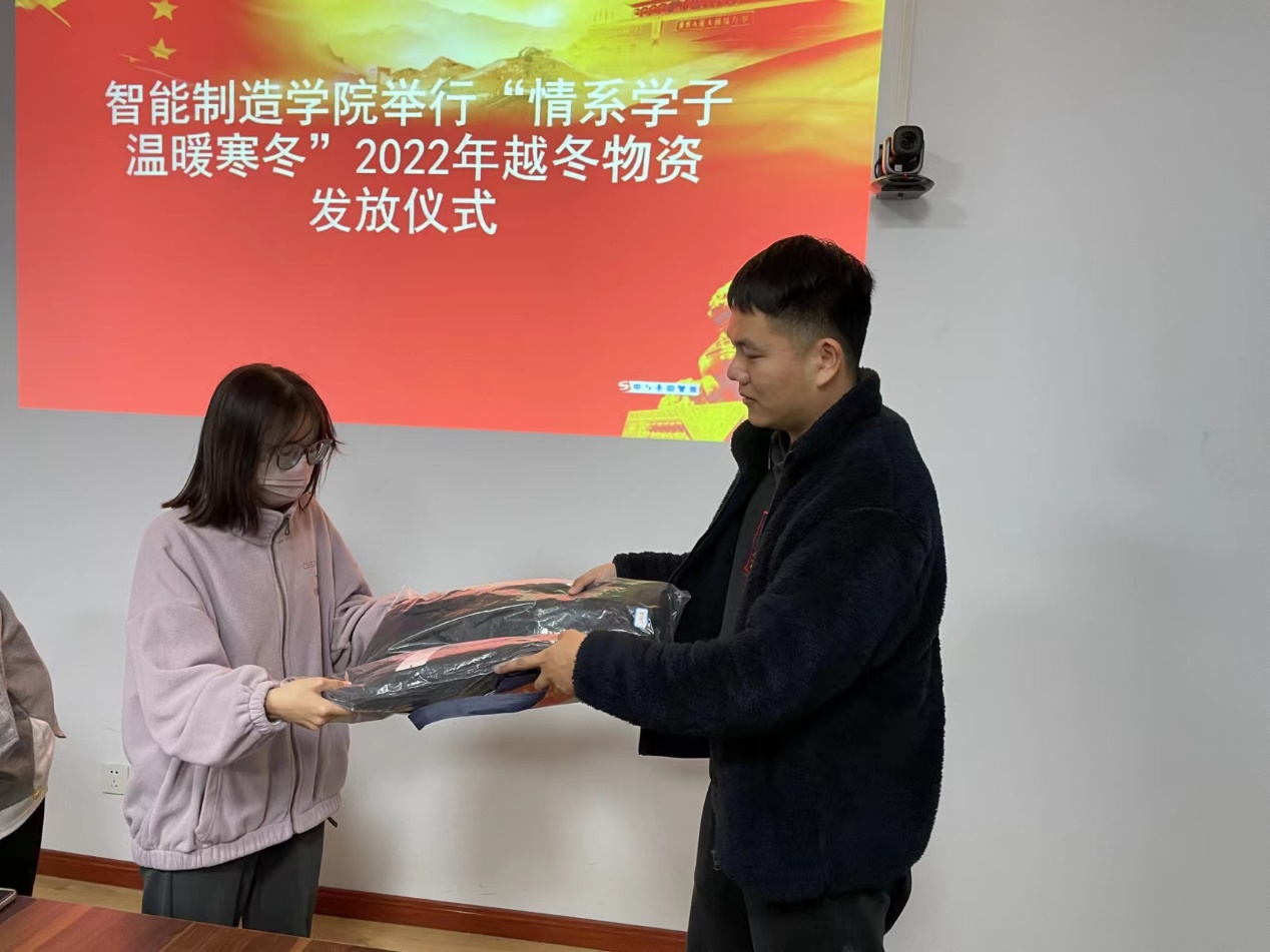 王文博老师代表学院表达了对受助学生的深切关怀,详细询问了学生们近期的学习和生活情况,提醒同学疫情防控期间做好个人日常防护,随后向受助学生发放了越冬物资。他表示越冬衣物发放是智能制造学院学生资助工作的一个重要组成部分,体现了学院领导和老师对同学们的关心关怀。同时饱含了学院老师对同学们的深切期待,希望同学们倍加珍惜大学的美好时光,勤奋学习,刻苦钻研,努力成为中华民族伟大复兴的有用之才。