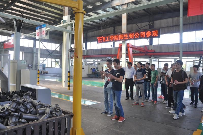 6月29日上午,机械学院45名学生在李冬生、石艳霞老师的带领下乘大巴车前往许昌远东传动轴公司参观考察。历经三个小时车程,顺利到达远东传动轴公司总部,“欢迎南阳理工学院师生到公司参观”的标语在公司的显示屏上滚动出现,带队老师与总公司人事部部长付东安简单接触后,由付部长带领师生考察。