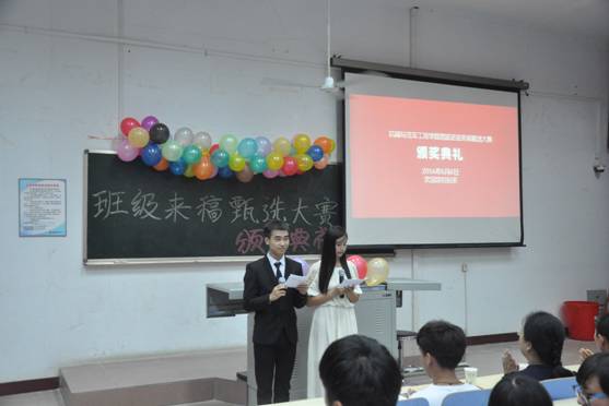 本报讯(通讯员:宁石东)2016年6月6日晚7:30机械与汽车工程学院首届班级来稿甄选大赛颁奖典礼在6#101顺利举行。辅导员老师及学生代表参加颁奖典礼。首先由机械学院院报通讯社记者团团长薛金鑫致开幕词,他对一直以来支持关心通讯社的老师们表示感谢,同时也对本次活动付出努力的通讯社小伙伴送上了谢意。开幕词后主持人宣布了本次比赛的一、二、三等奖得主,石艳霞、刘煜老师为获奖者进行颁奖。活动中间穿插有朗诵、独唱和现场抽奖等环节,一篇篇优秀的文章朗诵将颁奖典礼推向高潮。晚会在一首《仰望星空》中落下帷幕。李冬生老师对活动进行了点评,肯定了同学们的写作热情,希望大家在以后的学习生活中能够坚持读书写文章,这将会受益终生。