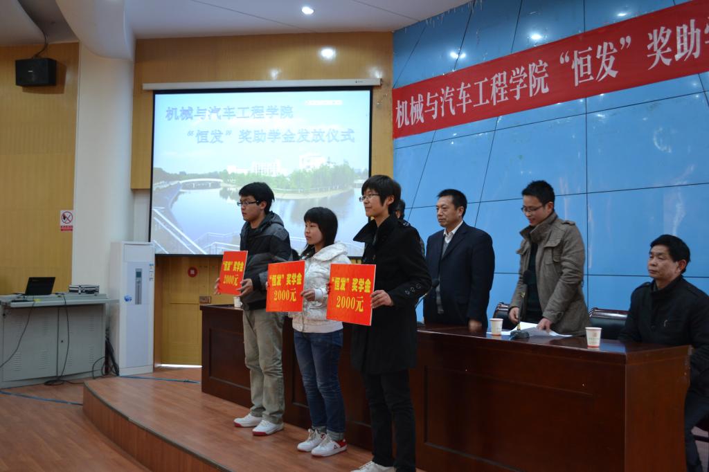 仪式开始后首先由恒发公司的副总经理孙士杰宣读了《机械与汽车工程学院关于表彰2011年度“恒发”奖学金、助学金获得者的决定》,并发放奖助学金。我院评出2011学年“恒发”奖学金、助学金获得者共21人。为表彰先进,学院决定对陈森永等13位获得“恒发”奖学金同学每人奖励2000元;对马明辉等8位获得“恒发”助学金的同学每人资助3000元。之后李总致辞,艰苦的创业经历和一路走来所遇的困难挫折,以及支撑其一直走下去的精神支柱——信心、决心和耐心,给了在场每一个人鼓励和面对困难时的勇气。他建议大学生应该始终以脚踏实地的态度干好每一件事,尤其要注重自身“德”方面的培养。随后王院长和田书记均提出大学生应加强对基础知识的掌握并能够应用到实际的生产生活中,要切实做到“一切从实际出发”。最终仪式圆满结束。