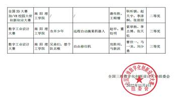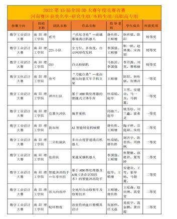 南阳理工学院智能制造学院15个团队在唐传胜、马新波、李国强等老师的指导下,荣获特等奖3项、一等奖3项、二等奖7项、三等奖2项,特等奖团队将参加全国总决赛。