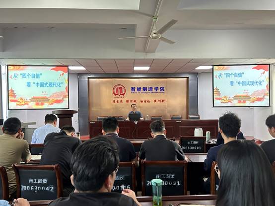 本网讯(特约记者/李媛)6月6日下午,副校长蔡广宇在6号教学楼3楼报告厅为智能制造学院全体党员师生开展《从“四个自信”看“中国式现代化”》专题党课。党课学习活动由智能制造学院党委书记万战争主持。