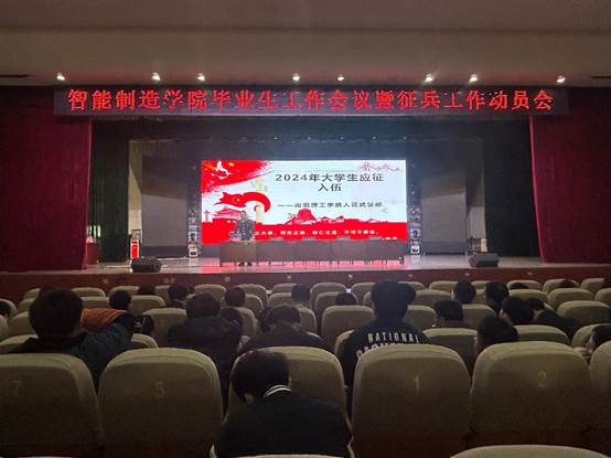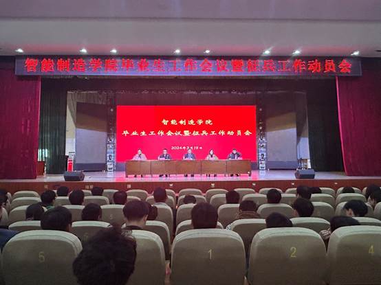 本网讯(特约记者/李媛)3月19日下午,智能制造学院在毕业礼堂举办召开毕业生工作会议暨征兵工作动员会,学院领导班子、年级辅导员、国防教育和征兵办副主任及2020级全体学生参加了本次会议。会议由学院党委副书记崔贺成主持。
